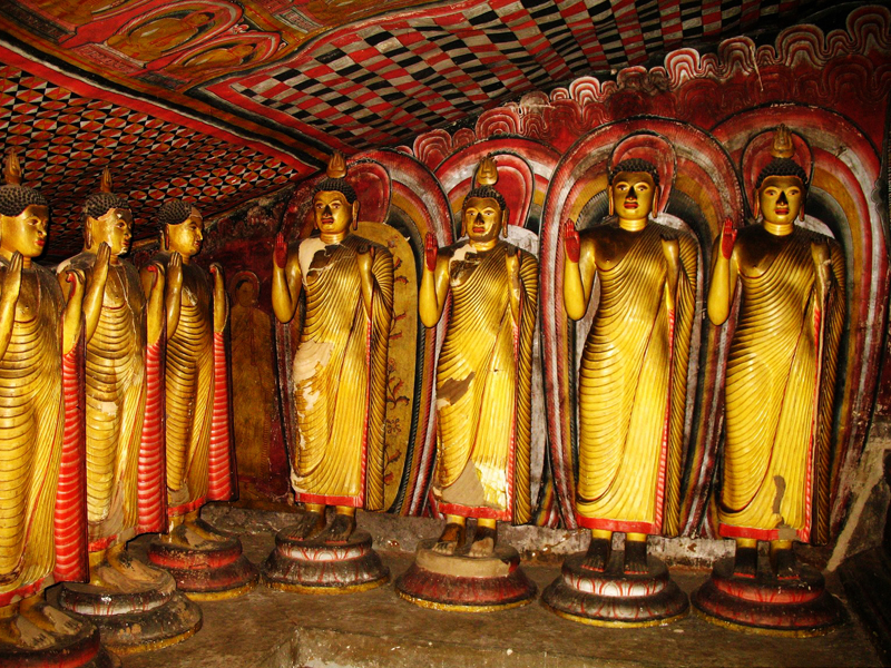 Dambulla - Dambulla is famous for the five cave temples on a rock. The first three caves are better, older and larger than the other two. Some caves date back to the 1st century BC. All the five cave walls and ceilings are covered with Buddhist murals and there are more than 130 Buddha statues. Statues of gods and kings are also found here.